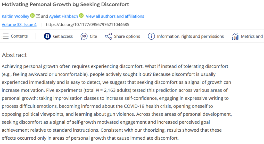 書中就講到一個研究案例,心理學家研究數百名參加即興喜劇班的學員,且隨機分配他們在學習時專注在不同心態上:一組專注在學習(這組被要求學員專注於學習新技巧,並觀察自己是否有所進步)、一組專注在刻意追求不適感,他們的目標是(讓自己感受尷尬與不適…那就是有練習到的跡象),結果發現堅持最久、最勇於嘗試創意冒險的人,是追求不適組。作者引用這篇研究,他既不是強調學習效果最好、也不在意天賦,他更強調的是「追求不適感」能有助於激發學員們的積極性,並提高他們對目標達成渴望,這些點面串聯成這些學員堅持而持續敢於嘗試,這才是學習到卓越,變得非常強的關鍵心態。